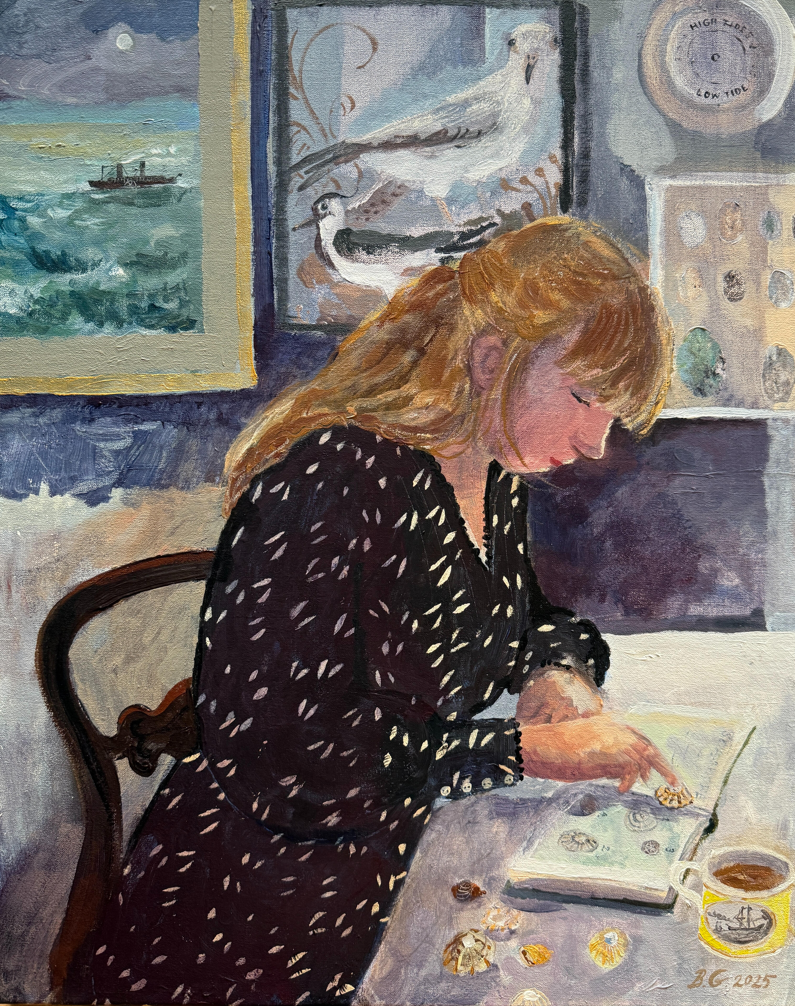 "I am moved by this painting. The sketched lines of the cupboard, scratched into the paint. The contrast of the light against the dark. The little girl in white sitting patiently, or perhaps impatiently, beside the enormous black cupboard, hands behind her back. Life is only just beginning. Sunlight pouring though the window. All the glistening treasure inside the cupboard, all the treasure glistening inside of her."